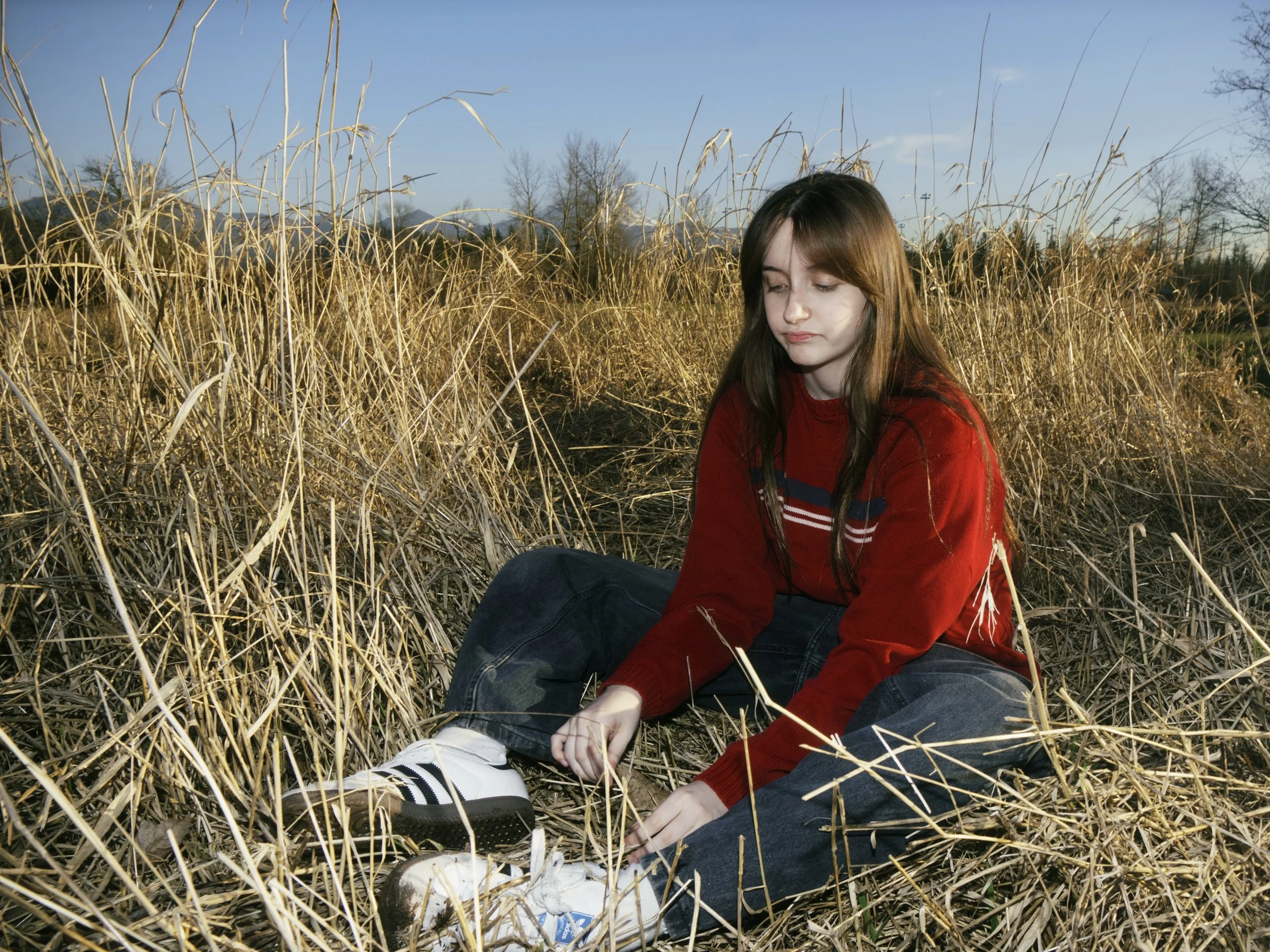 A girl sitting in a field of tall dry grass on a sunny day, wearing a red sweater, dark pants, and white sneakers. View fullsize