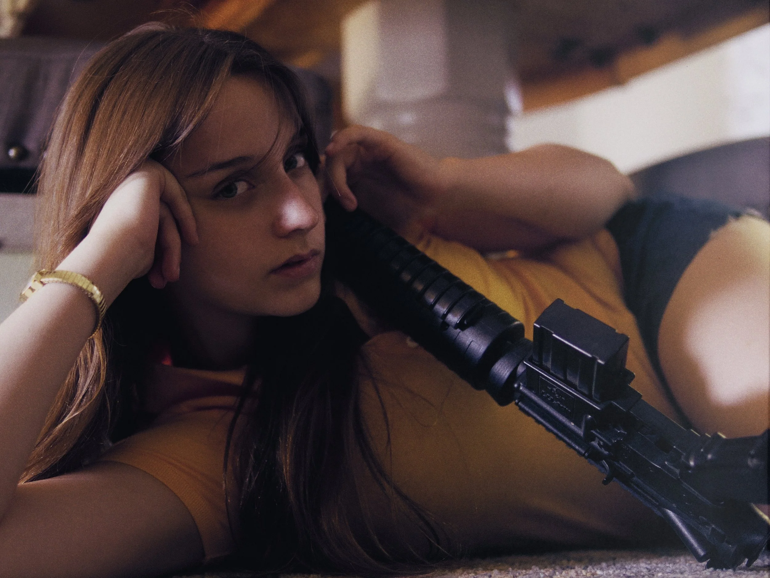 Young woman with long brown hair lying on the floor, resting her head on her hands, with a rifle resting on her shoulder.