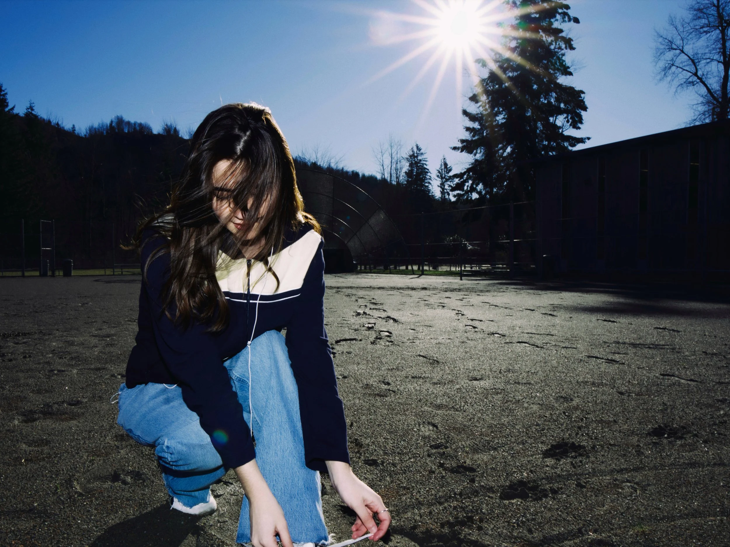 A young woman with long dark hair, wearing a navy and cream jacket and blue jeans, is squatting on cracked asphalt ground outdoors with a fence and trees in the background. The sun is shining brightly in the clear blue sky.